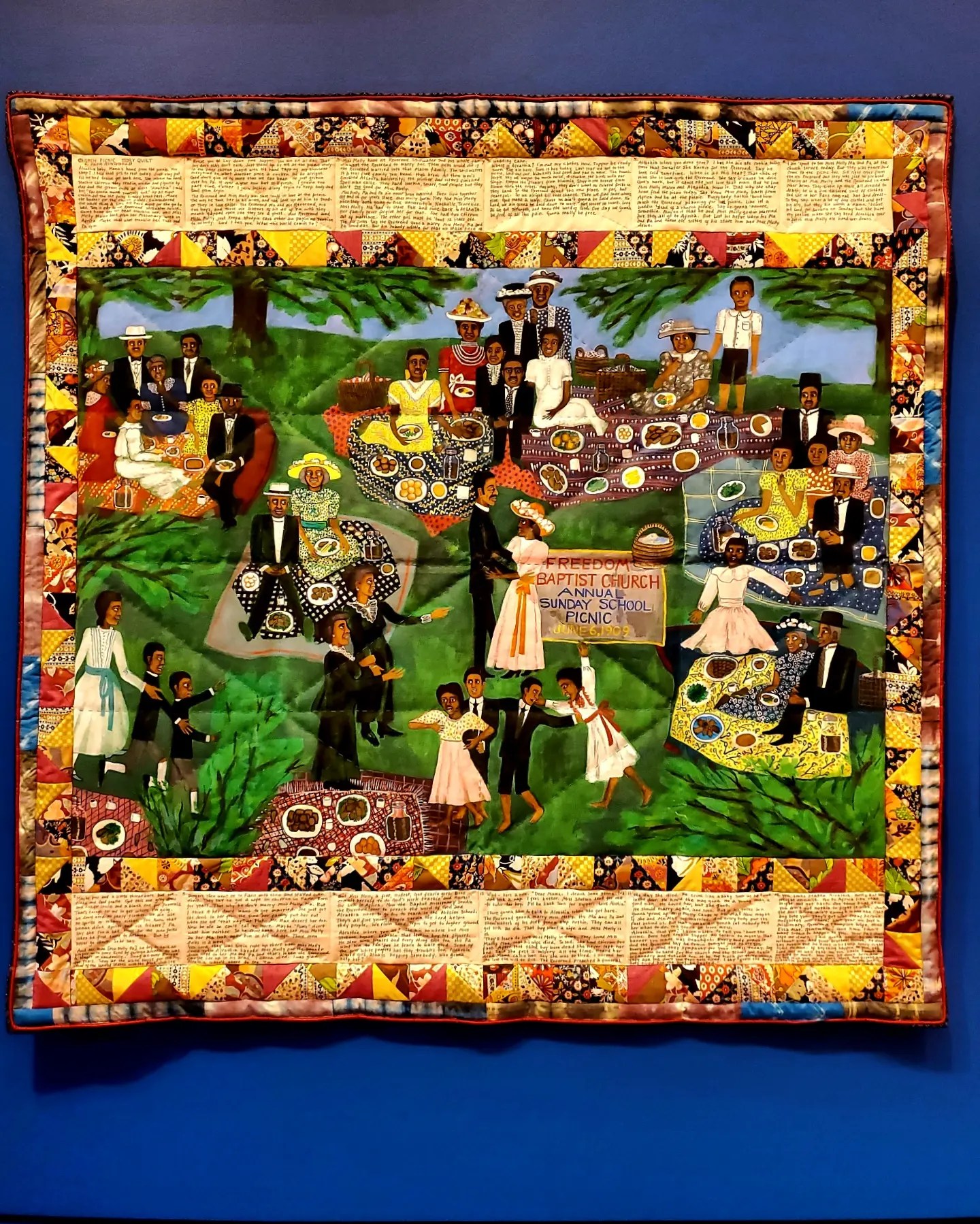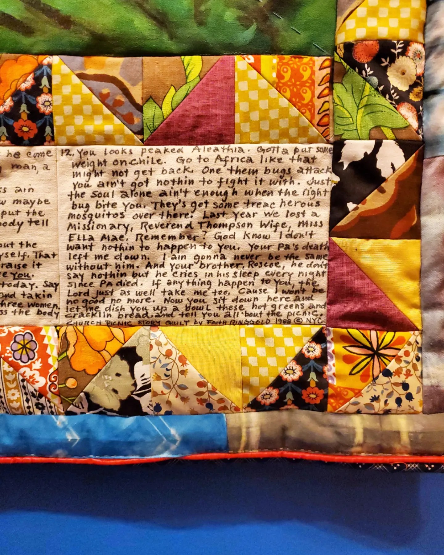 In mine, this exhibit immediately stopped my heart. It opens with Faith Ringgold’s “Church Picnic Story Quilt.” You can dig up the full 12-panel story, but I knew I’d find real truth here (and it was meant for me to find) when I saw Ella Mae and Roscoe as characters. Ella Mae is the name of my grandmother, and her son and grandson are Roscoe. I don’t believe in coincidences that great.